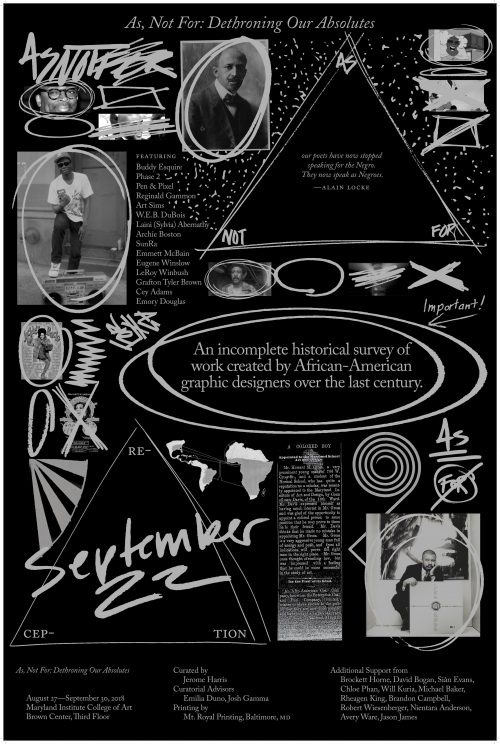 Harris’ research into the exclusion of African-American graphic designers has manifested as an exhibition which is showing at multiple universities and arts organizations throughout 2019. The exhibition, As, For Not: Dethroning Our Absolutes: an incomplete historical survey of work created by African-American graphic designers over the last century, was originally mounted at Maryland Institute College of Art (MICA) and went on to show at RISD,and at the Jacob Lawrence Gallery and Non-Breaking Space in Seattle, Washington in Spring 2020.